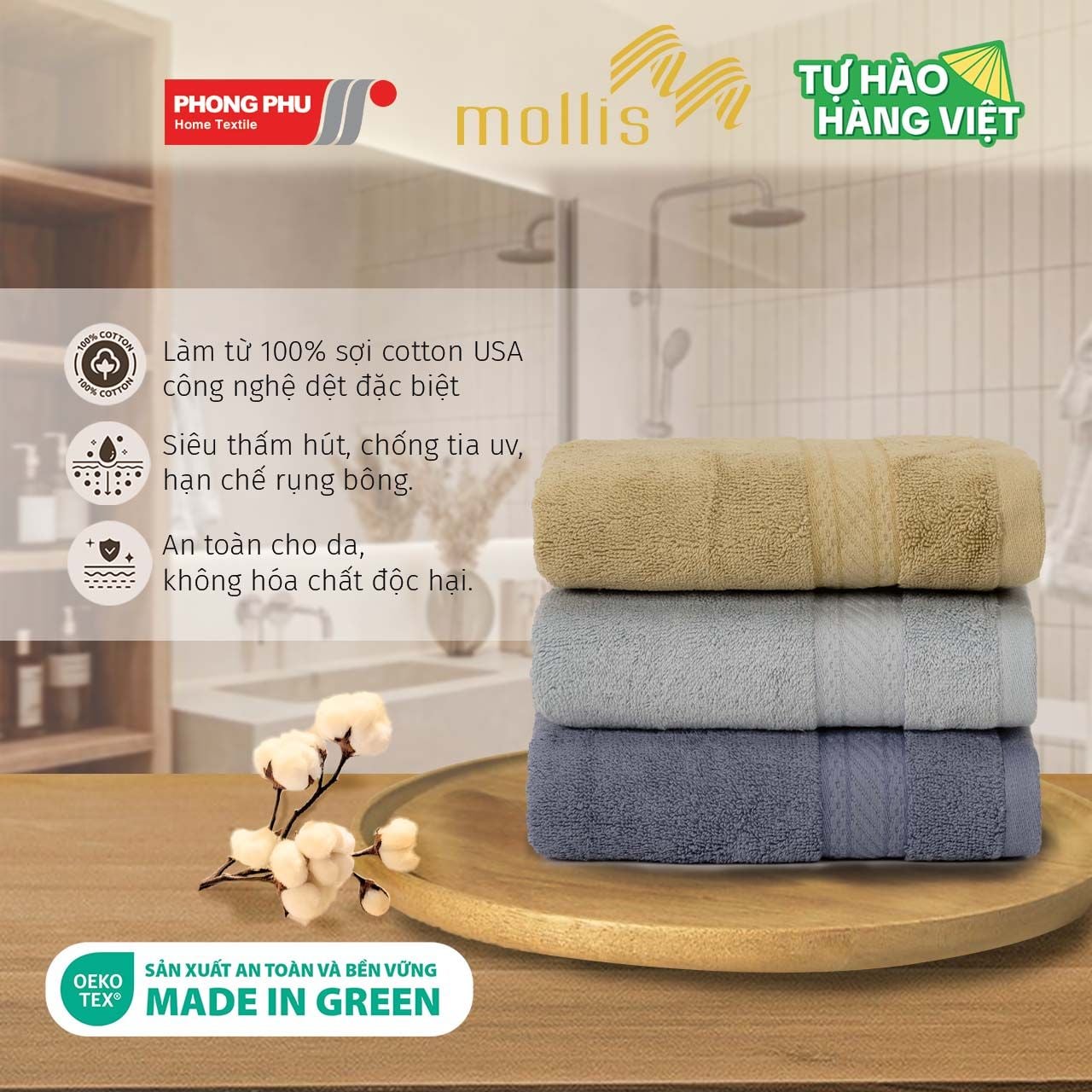 1. Thông Tin Sản Phẩm - Mã sản phẩm: Khăn Mặt FM8V - Thương hiệu: Mollis - Kích thước: 34 x 78 cm - Chất liệu: Cotton Lapyarn - Cân nặng: 115g - Sản xuất: Công ty Dệt Gia Dụng Phong Phú - Số lượng: 3 2." with " 2.", Replaced: "Cotton Lapyarn -" with "Cotton -", Deleted: "Công nghệ dệt tiên tiến chỉ có ở khăn Mollis Phong Phú. Khác với sợi Cotton với cách dệt thông thường, Sợi bông Lapyarn được se ít hơn nên giúp khăn Lapyarn thấm hút và nhanh khô hơn. Ngoài ra còn giảm tình trạng xù lông hiệu quả -", Replaced: "hút và nhanh khô hơn với sợi bông thông thường 3." with "hút, mềm mịn, mang lại cảm giác thoải mái cho người dùng - Không sử dụng các chất gây hại cho người tiêu dùng 3.", within "1. Thông Tin Sản Phẩm - Mã sản phẩm: Khăn Mặt FM8V - Thương hiệu: Mollis - Kích thước: 34 x 78 cm - Chất liệu: Cotton Lapyarn - Cân nặng: 115g - Sản xuất: Công ty Dệt Gia Dụng Phong Phú - Số lượng: 3 2. Về chất liệu: Sợi: Cotton Lapyarn - Làm từ 100% sợi Cotton Nhập Mỹ, đạt chứng chỉ Cotton USA - Công nghệ dệt tiên tiến chỉ có ở khăn Mollis Phong Phú. Khác với sợi Cotton với cách dệt thông thường, Sợi bông Lapyarn được se ít hơn nên giúp khăn Lapyarn thấm hút và nhanh khô hơn. Ngoài ra còn giảm tình trạng xù lông hiệu quả - Thấm hút và nhanh khô hơn với sợi bông thông thường 3. Về Phong Phú - Phong Phú thành lập năm 1964 đến nay có kinh nghiệm dày dặn về sản xuất Khăn Bông vơi độ thấm hút tốt, nhanh khô và khô thoáng. Khăn tắm, khăn mặt, khăn tay của Phong Phú có nguồn gốc rõ ràng, tự nhiên, an toàn cho dù là làn da nhạy cảm - Dệt May Phong Phú sản xuất và xuất khẩu hơn 25 quốc gia, khăn Phong Phú đã có mặt tại các thị trường khó tính như Mỹ, Nhật Bản, Hàn Quốc, Úc... - Khăn Phong Phú được các bệnh viện phụ sản lớn như bệnh viện Từ Dũ, bệnh viện Hùng Vương, bệnh viện An Sinh...chọn là nhà cung cấp khăn cho các trẻ sơ sinh chào đời - Tự hào là đơn vị đầu tiên tại Việt Nam nhận chứng chỉ Eoke-Tex STeP chứng nhận khăn an toàn và không độc hại và có trách nhiệm với xã hội trong sản xuất, ISO 9001-2015 và ISO 14001-2015, 8 lần liên tiếp nhận giải thưởng THƯƠNG HIỆU QUỐC GIA, Global Organic Textile Standard (GOTS), Organic Content Standard (OCS) - Bộ sản phẩm khăn quà tặng Mollis với bao bì thiết kế độc đáo, đẹp, trang nhã là sự lựa chọn hoàn hảo, rất phù hợp để tặng đối tác, nhân viên, bạn bè và người thân, hoặc các ngày lễ đặc biệt như sinh nhật công ty, hội nghị khách hàng, 8/3, 20/10, 20/11… - Liên hệ tư vấn: 07 68 60.60 68 Hướng dẫn sử dụng - Giặt trước khi sử dụng - Hạn chế giặt khăn chung với áo quần có khoá, sắt nhọn làm bung sợi cotton tự nhiên. - Không sủ dụng chất tẩy mạnh và phơi ngoài nắng gắt - Nên dùng riêng khăn với các mục đích khác nhau. - Thay khăn sau 3 tháng sử dụng để bảo vệ làn da.