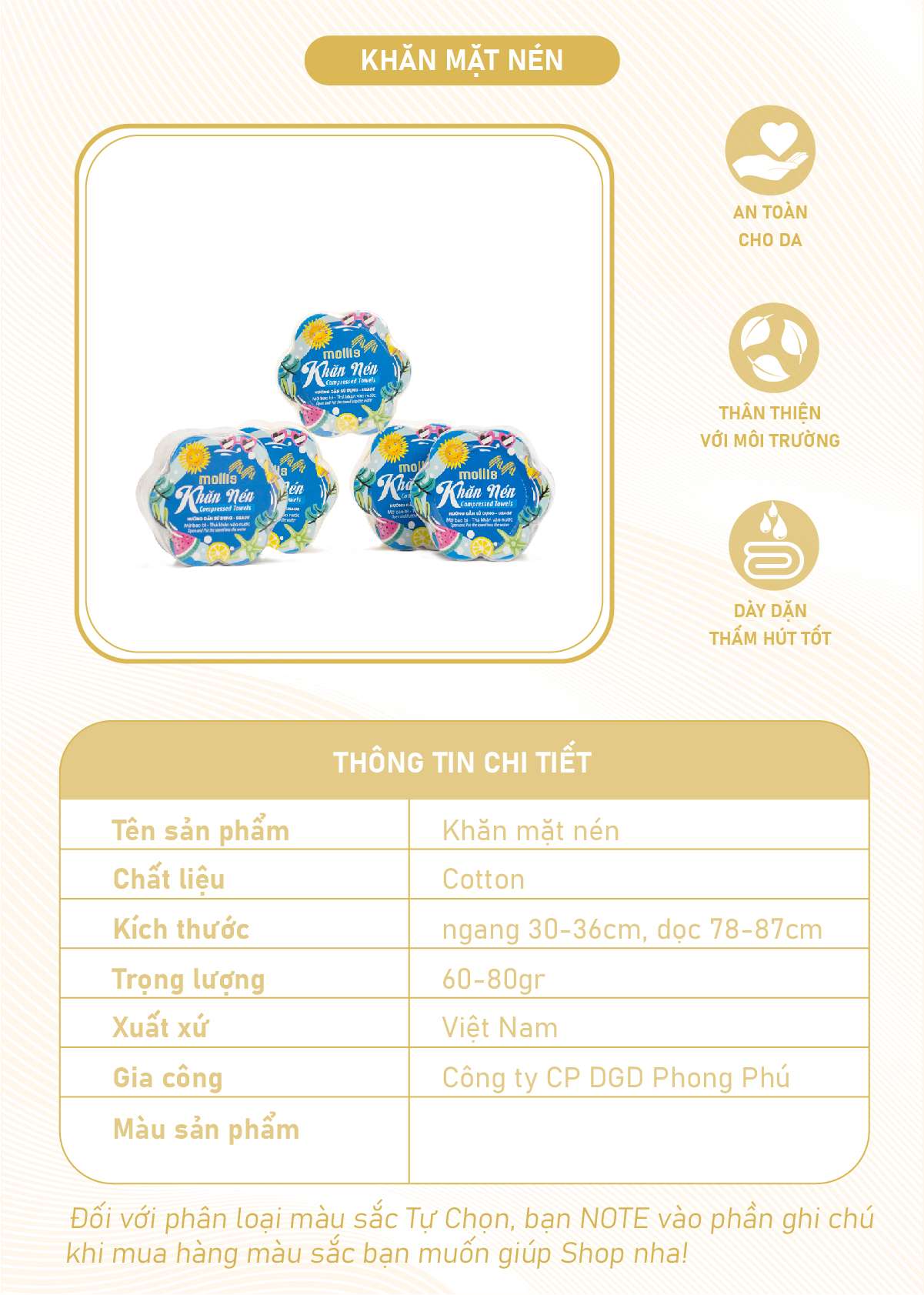 Khăn nén Mollis làm từ 100% Cotton mềm mại, gọn nhẹ và dễ dàng mang theo khi đi du lịch, công tác hay tập gym. Khăn có khả năng siêu thấm hút, nhanh khô và an toàn cho da. Thiết kế nén tiện lợi, chỉ cần thấm nước là khăn bung nở đầy đủ kích thước, sẵn sàng sử dụng mọi lúc mọi nơi.