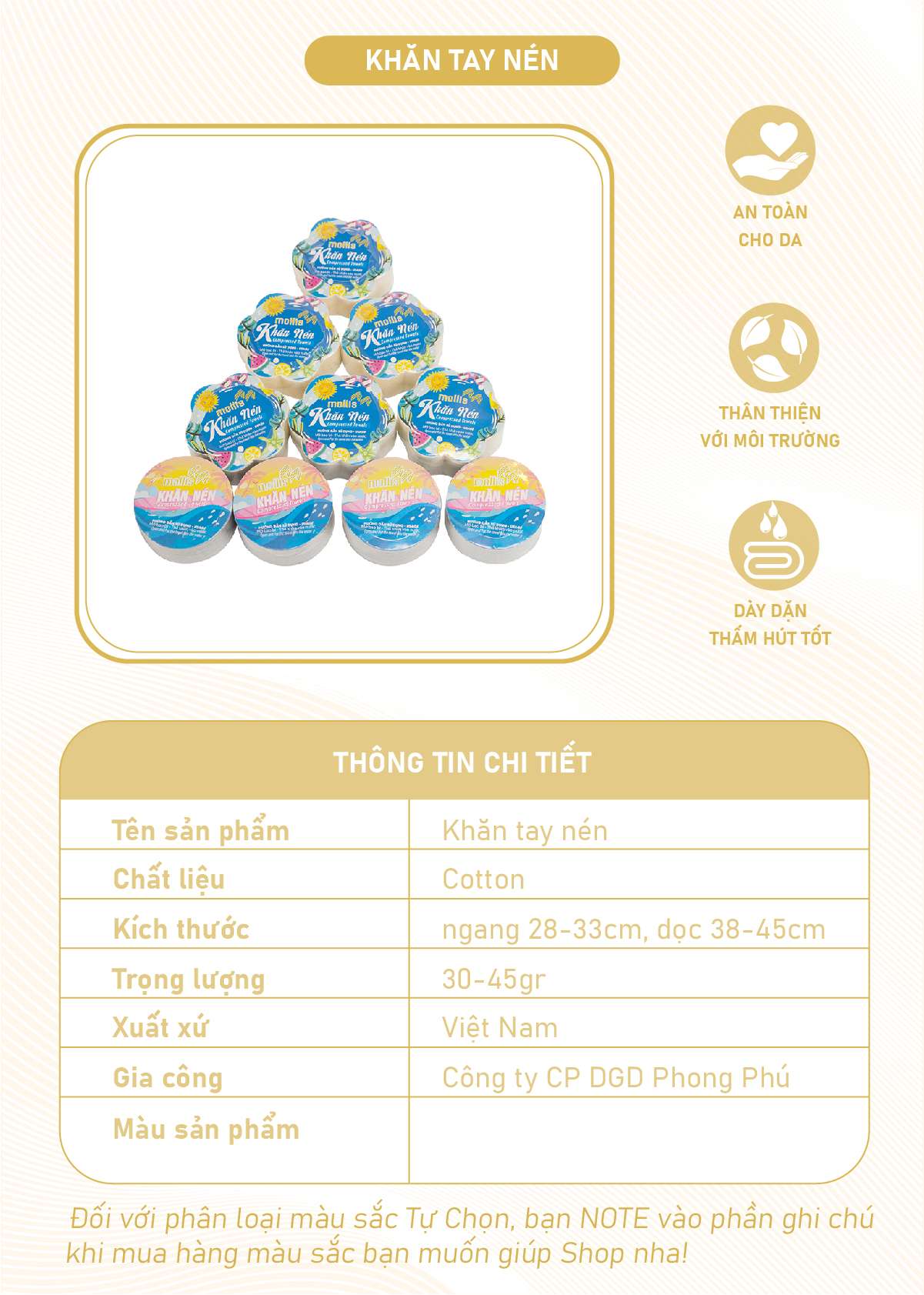 Khăn nén Mollis làm từ 100% Cotton mềm mại, gọn nhẹ và dễ dàng mang theo khi đi du lịch, công tác hay tập gym. Khăn có khả năng siêu thấm hút, nhanh khô và an toàn cho da. Thiết kế nén tiện lợi, chỉ cần thấm nước là khăn bung nở đầy đủ kích thước, sẵn sàng sử dụng mọi lúc mọi nơi.